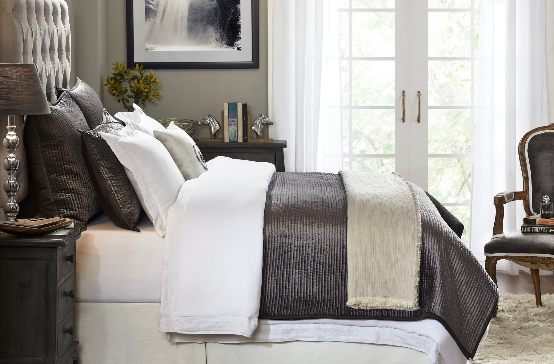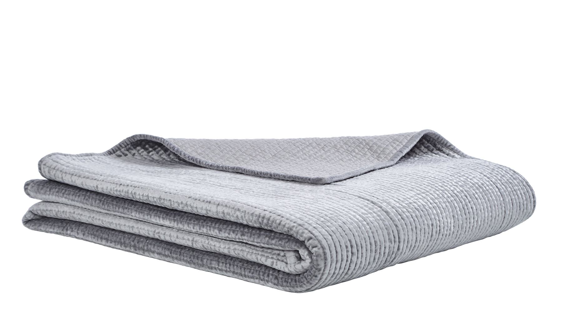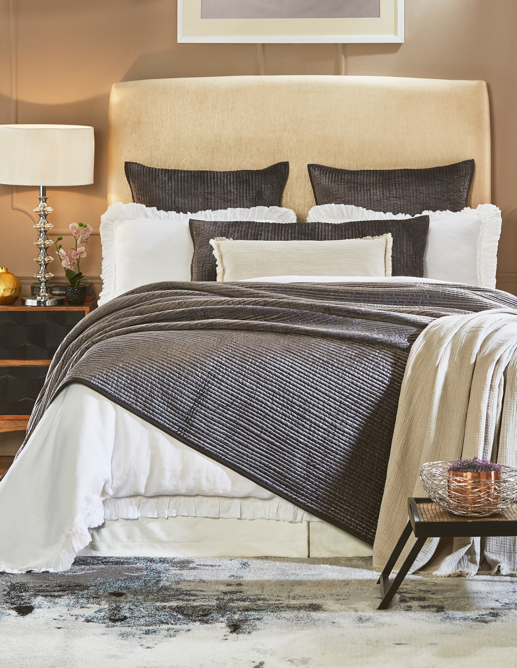 A chic, subtle stripe pattern is created with hand-guided channel-pattern quilting and takes our Cotton viscose velvet bedding to the highest level of plush. The Coverlet is backed in 300 thread-count Cotton Sateen for a smooth contrast to the velvet’s lustrous finish and luxuriant hand.