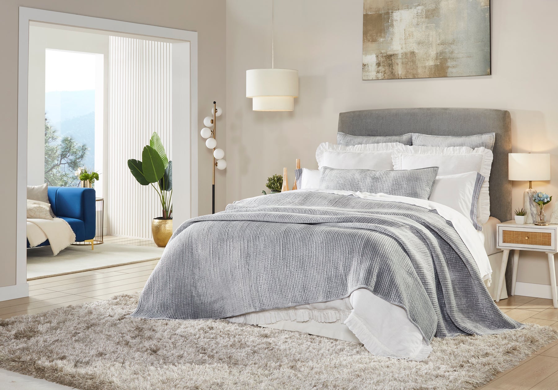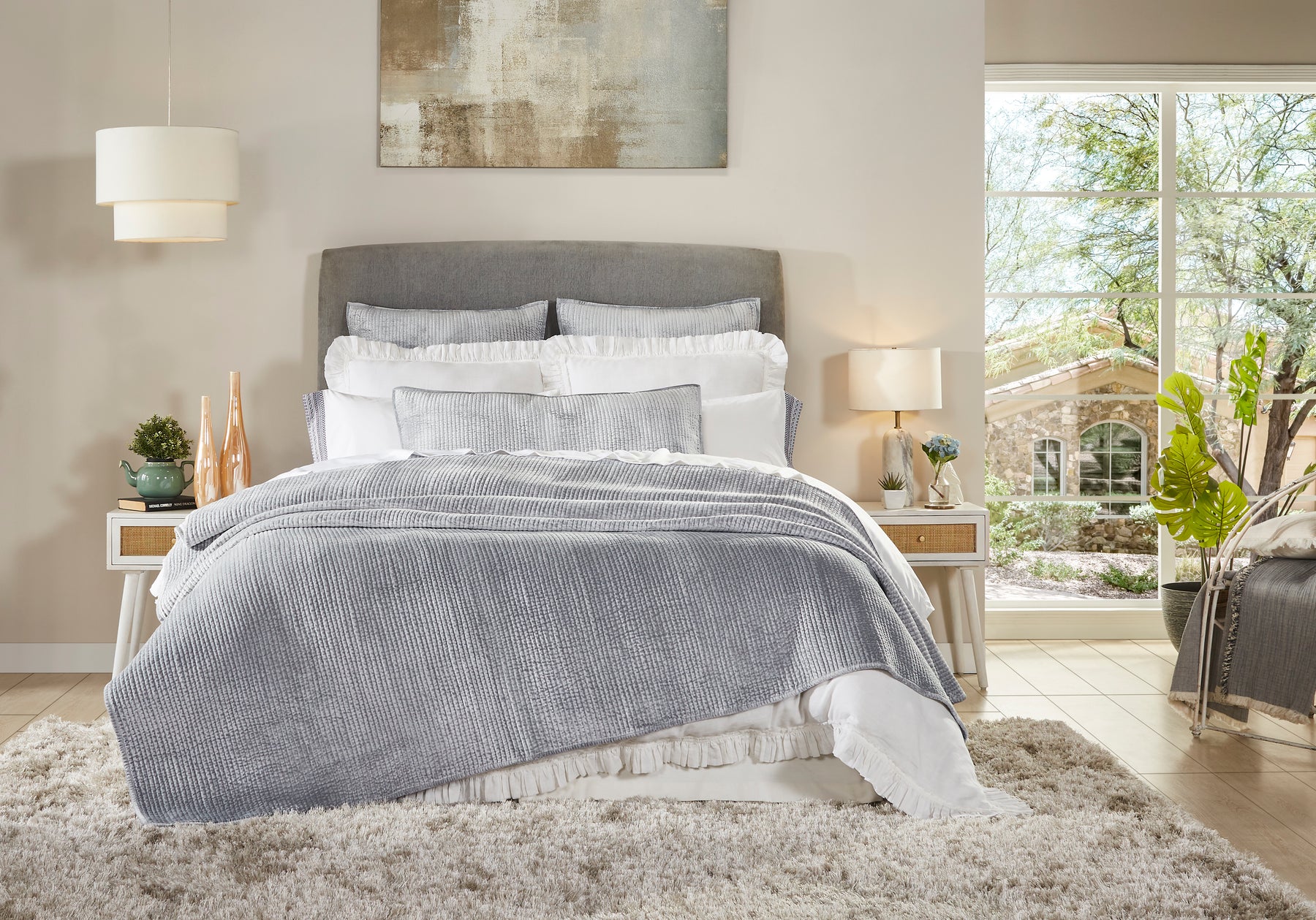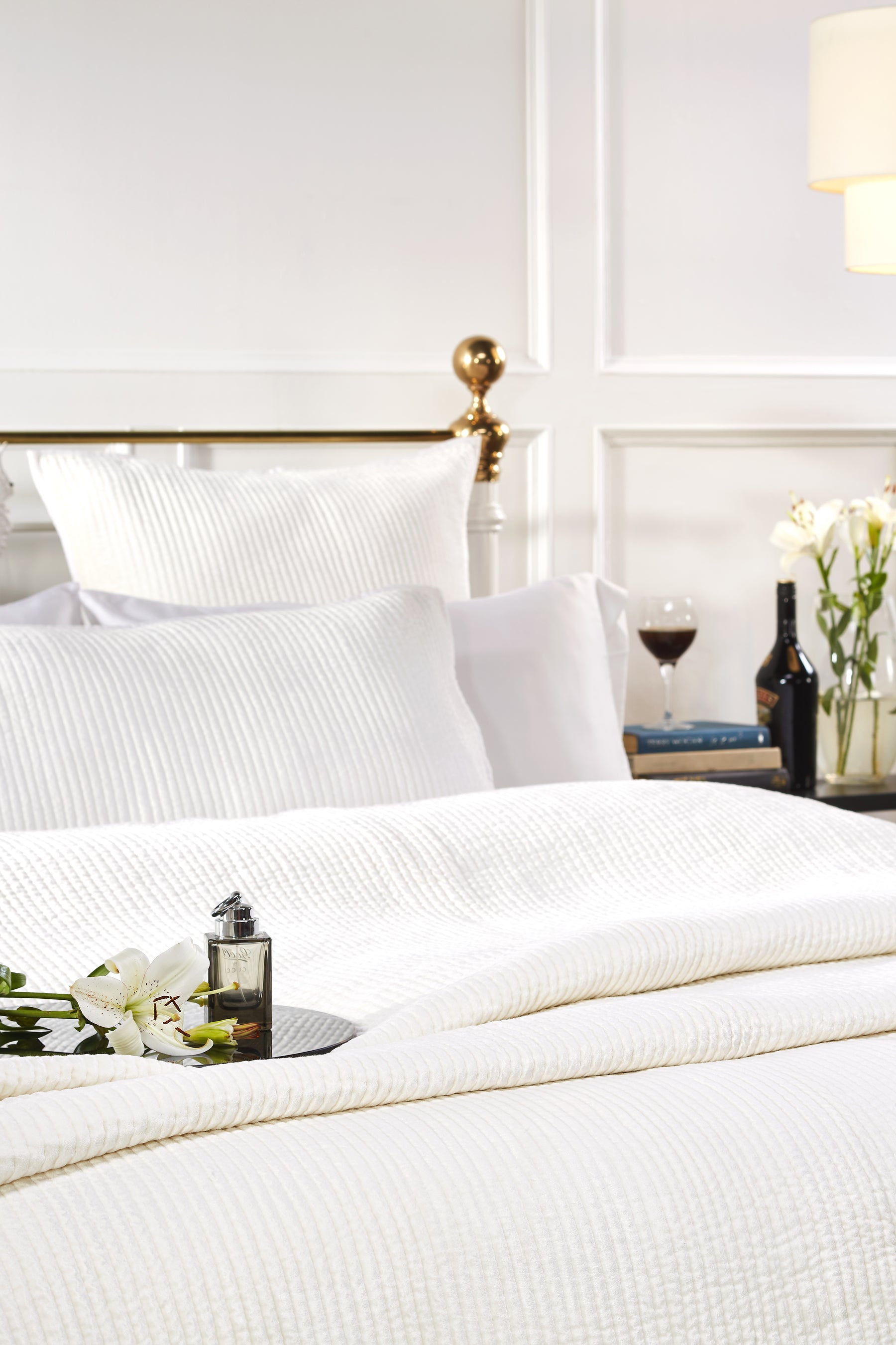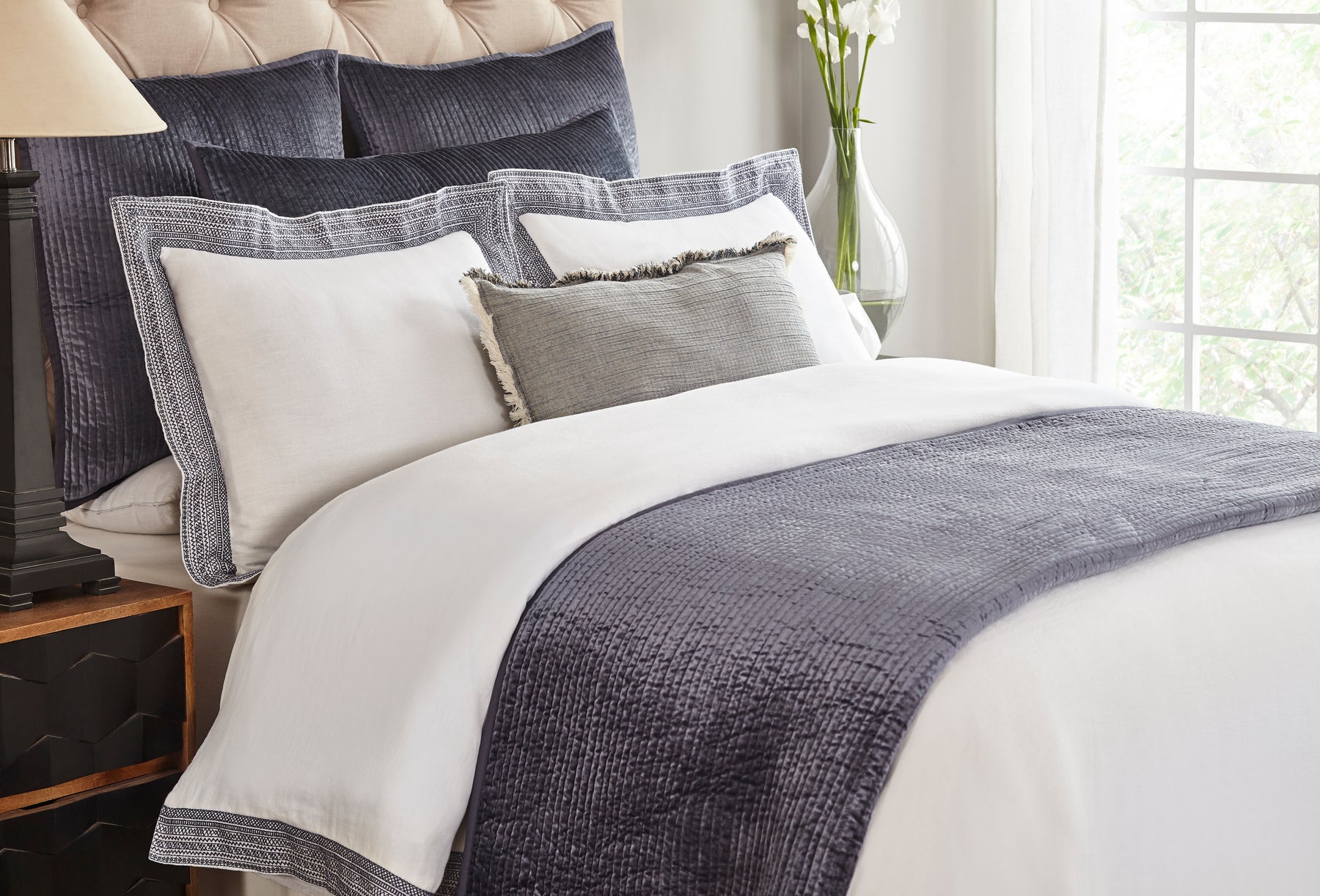 A chic, subtle stripe pattern is created with hand-guided channel-pattern quilting and takes our Cotton viscose velvet bedding to the highest level of plush. The Coverlet is backed in 300 thread-count Cotton Sateen for a smooth contrast to the velvet’s lustrous finish and luxuriant hand.