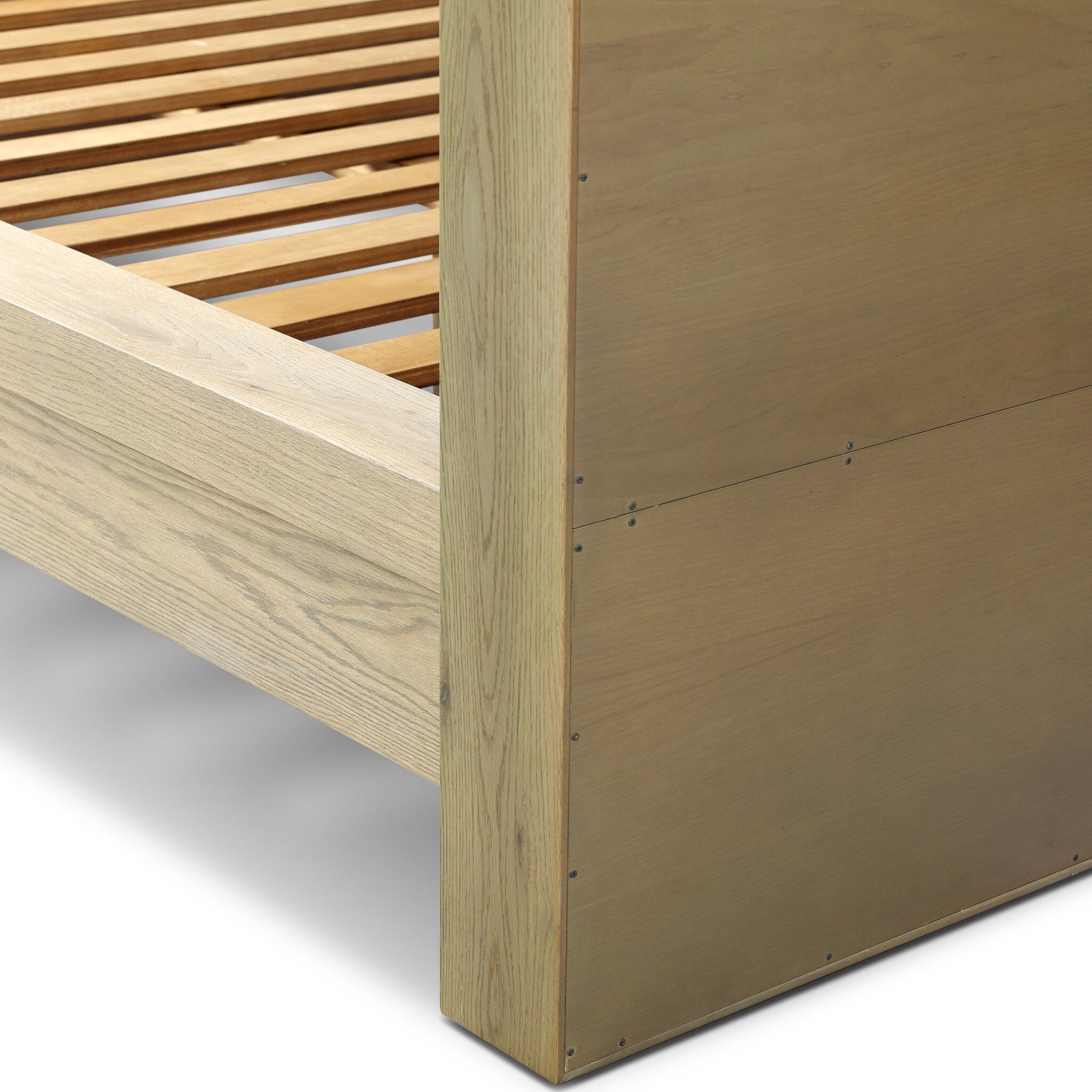 Minimalist and authentically platform, this resawn oak bed has a high-rise headboard for an understated modern look.