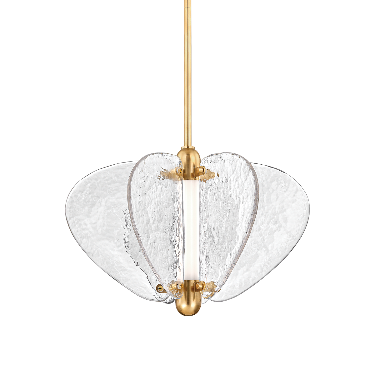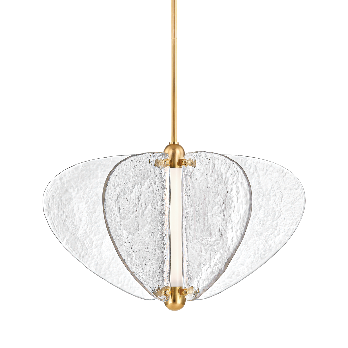 A frosty chill meets the warmth of LED in this sculptural pendant light. Resembling sheets of ice, four thin Piastra glass blades with chill marks extend from a central opal glossy glass core. A Vintage Brass framework provides a golden glow that enhances this pendants sparkle when lit.