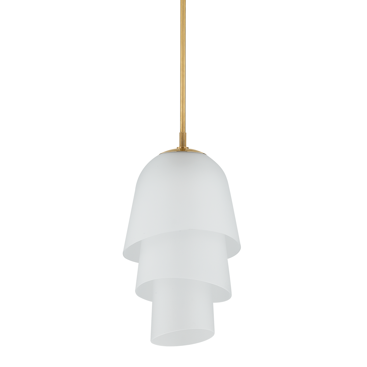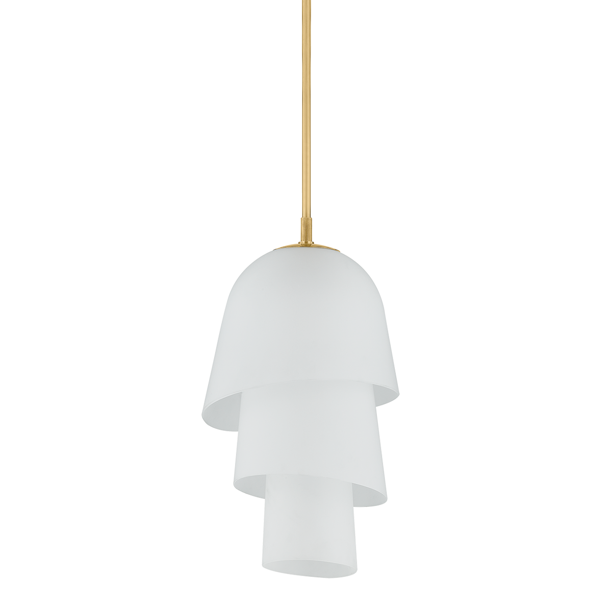 Recalling the shape of a bluebell, the Hela pendant features a three-tiered bloom crafted from etched clear glass. The bias cut on the glass ends enhances the overall fluidity of the silhouette, creating a sense of movement from every angle. When illuminated, Hela emits a warm diffusion of light that is complemented by a Vintage Brass rod.