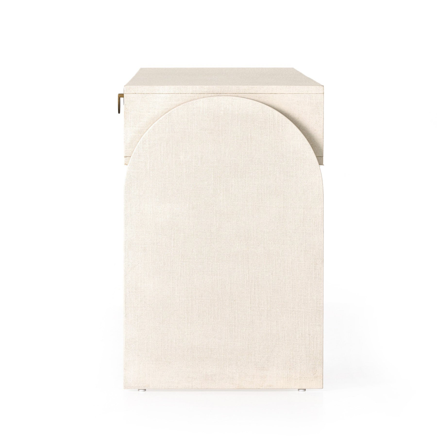 Talk about novelty. Made from painted linen in a light ivory, arched legs soften otherwise clean, modern shaping. Three drawers bring bonus storage space to the living or media room, while half-moon iron hardware adds a hint of art deco style.