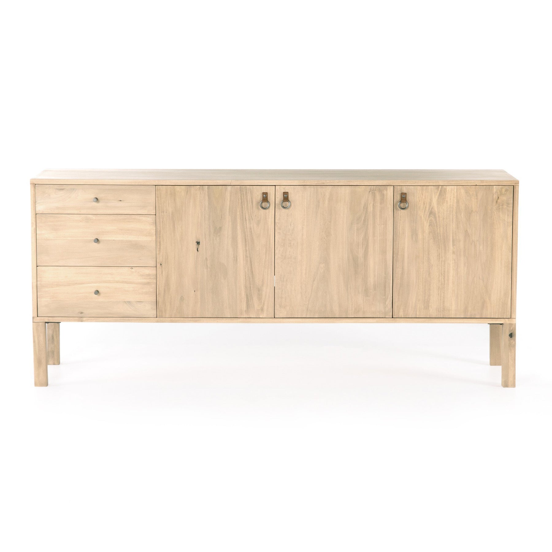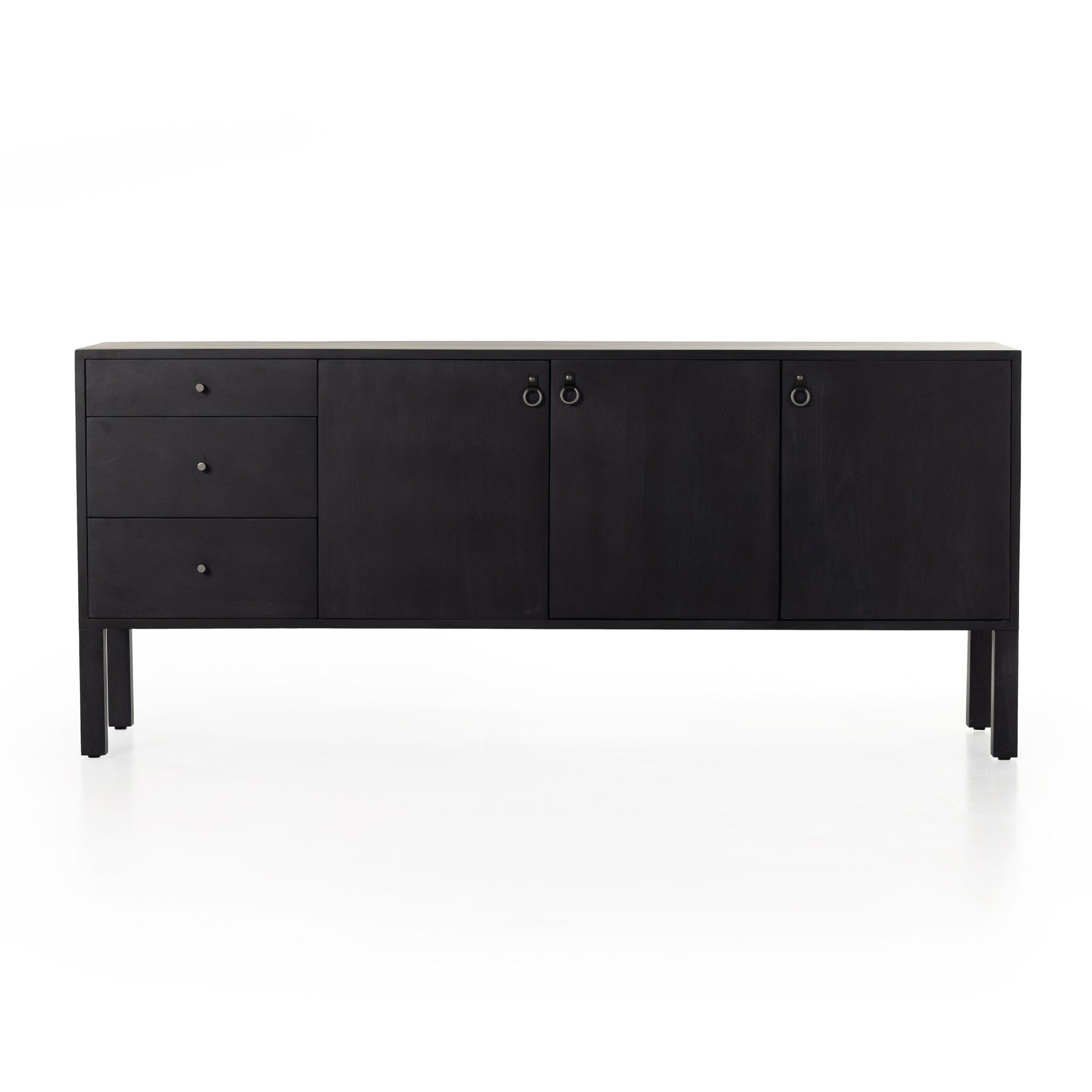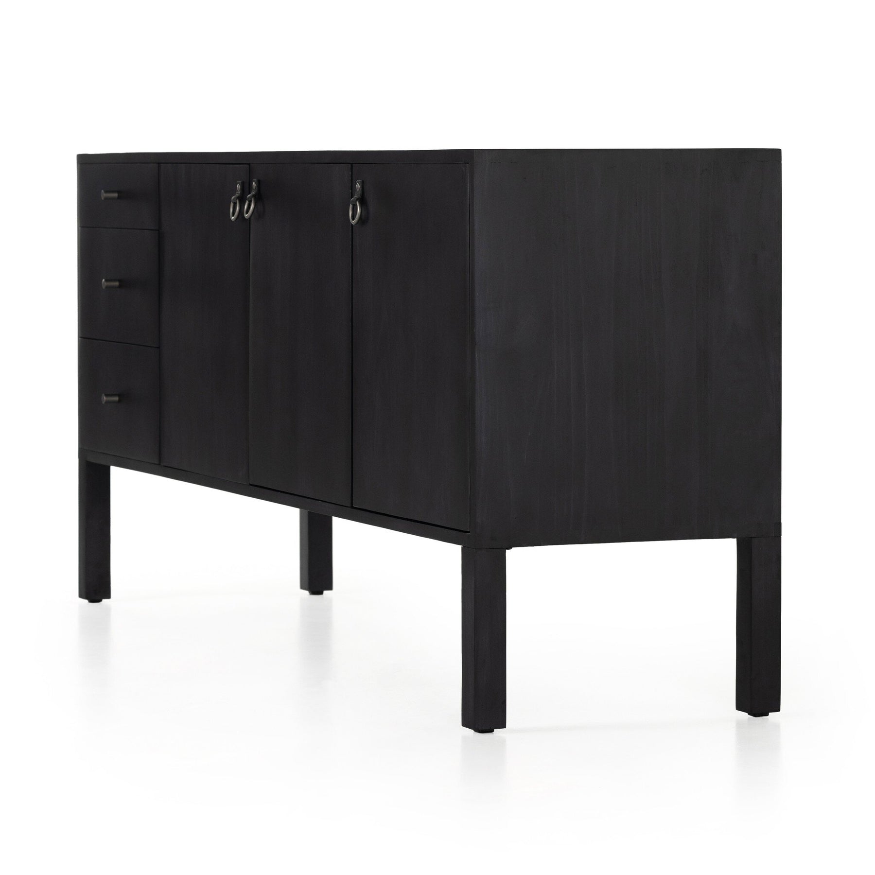 Beautifully simple in spirit. Black-washed solid poplar forms a Parsons-style sideboard with faux dovetail joinery plus iron and leather hardware, for a material-driven update to Shaker-inspired styling. Rear cutouts for cord management.