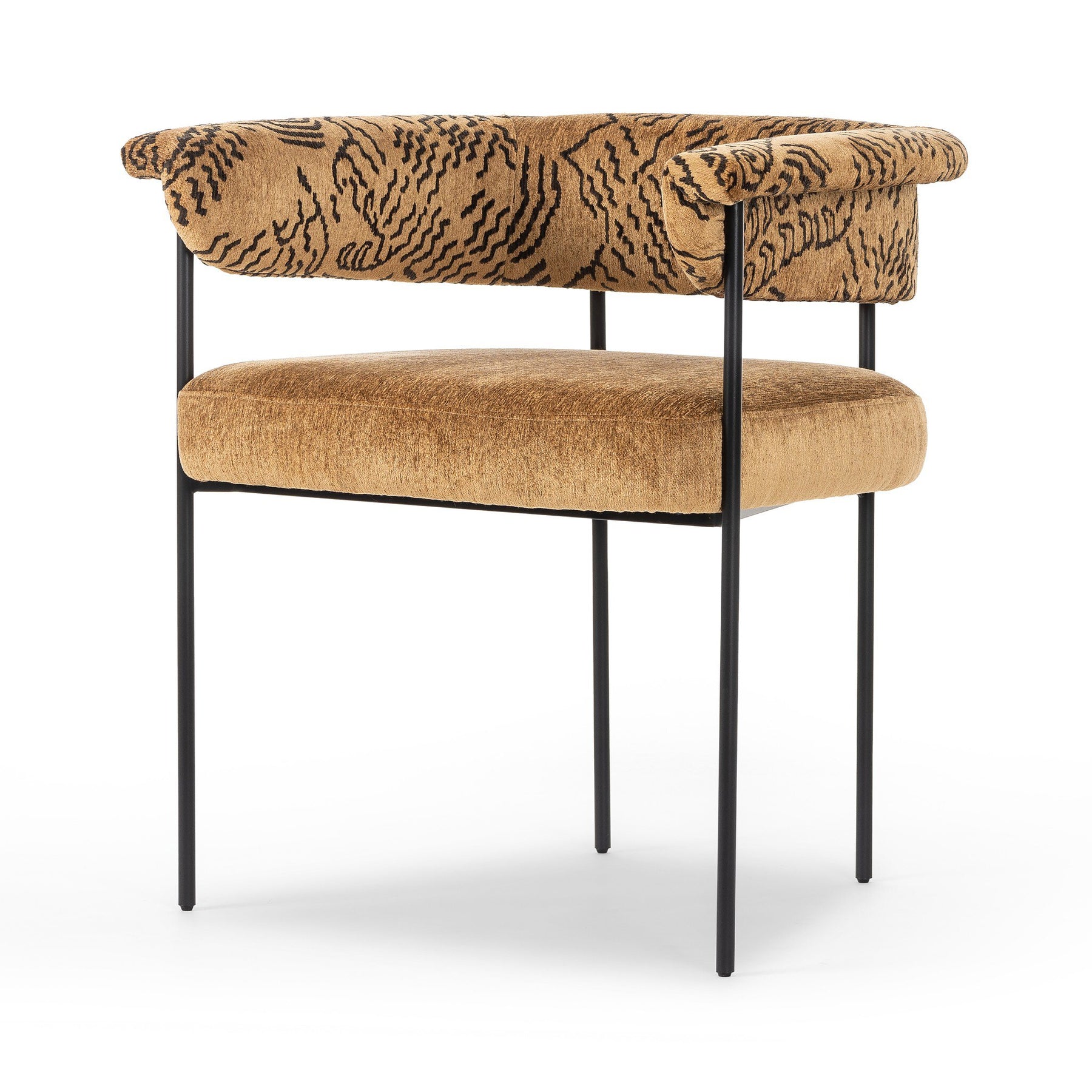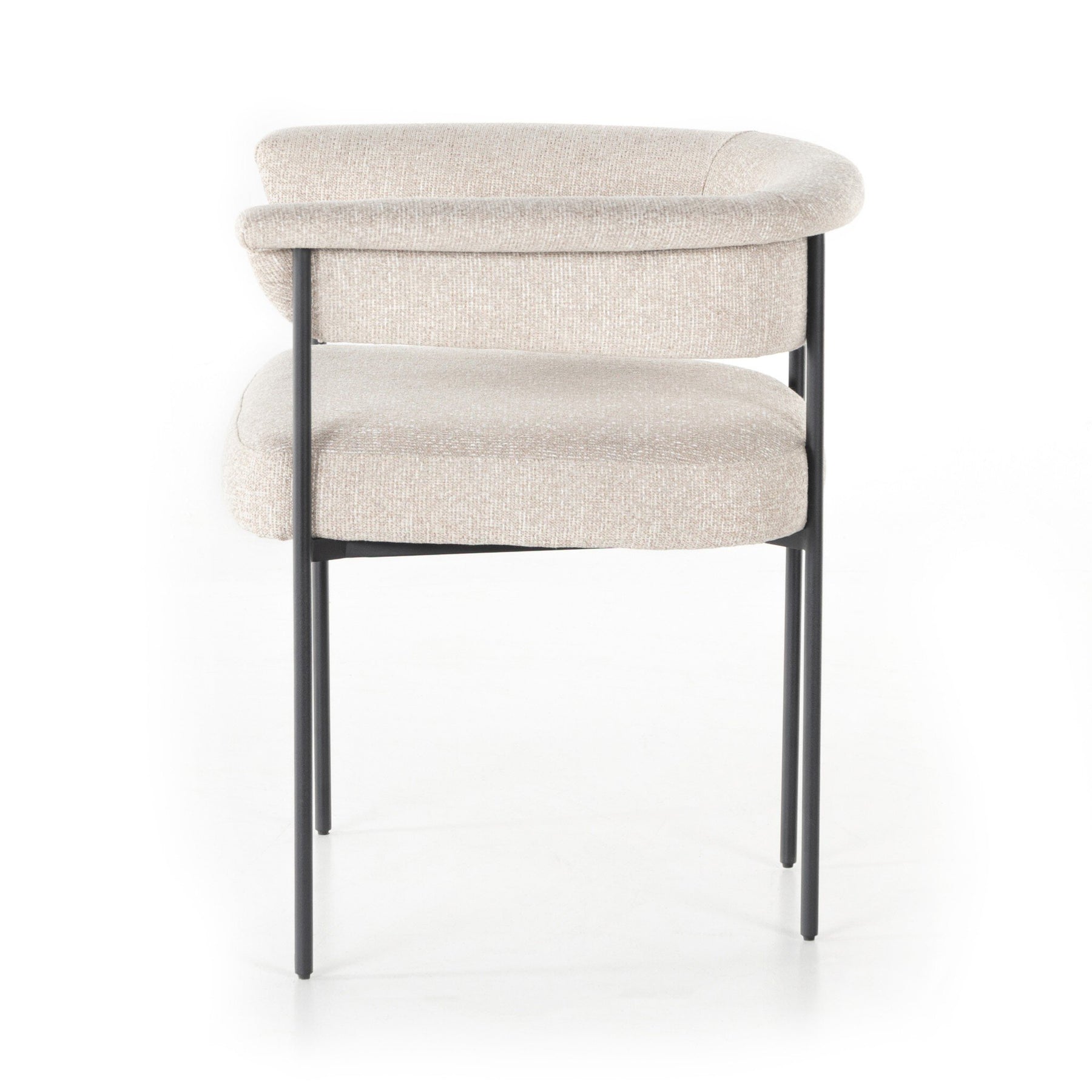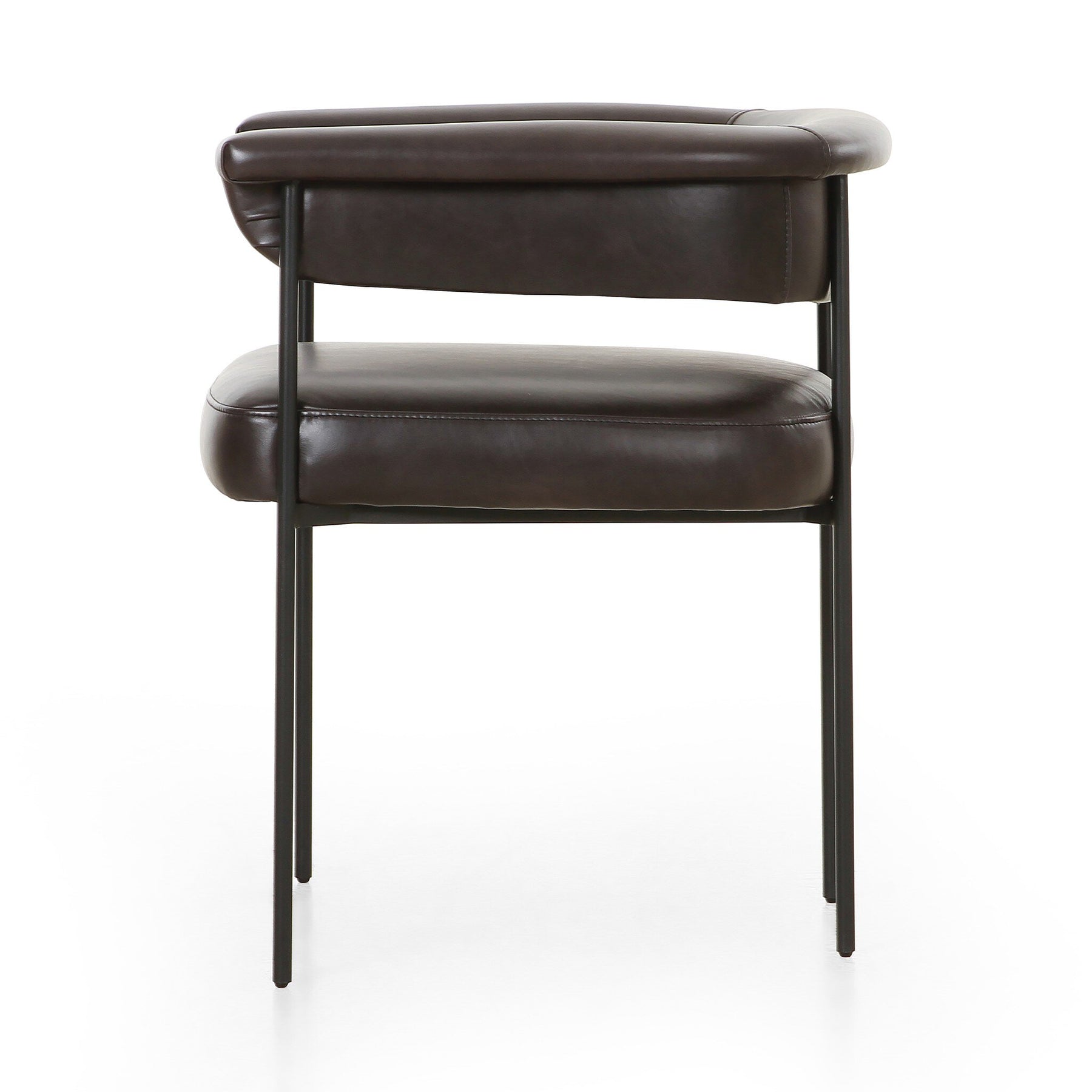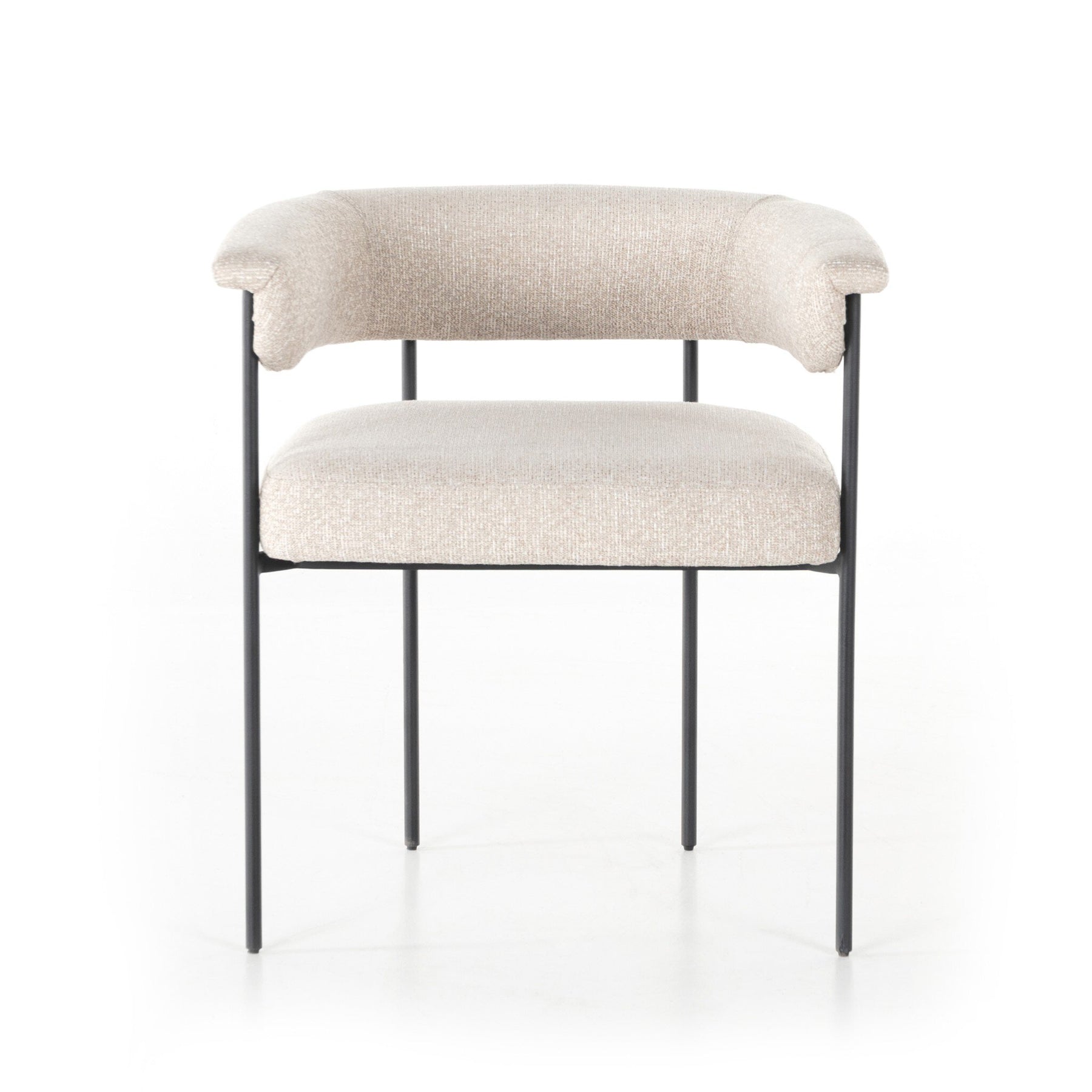 Airy and light with slim, black-finished iron framing, lends texture to a beautifully sculpted dining style featuring a yoke back and exterior fold detailing.