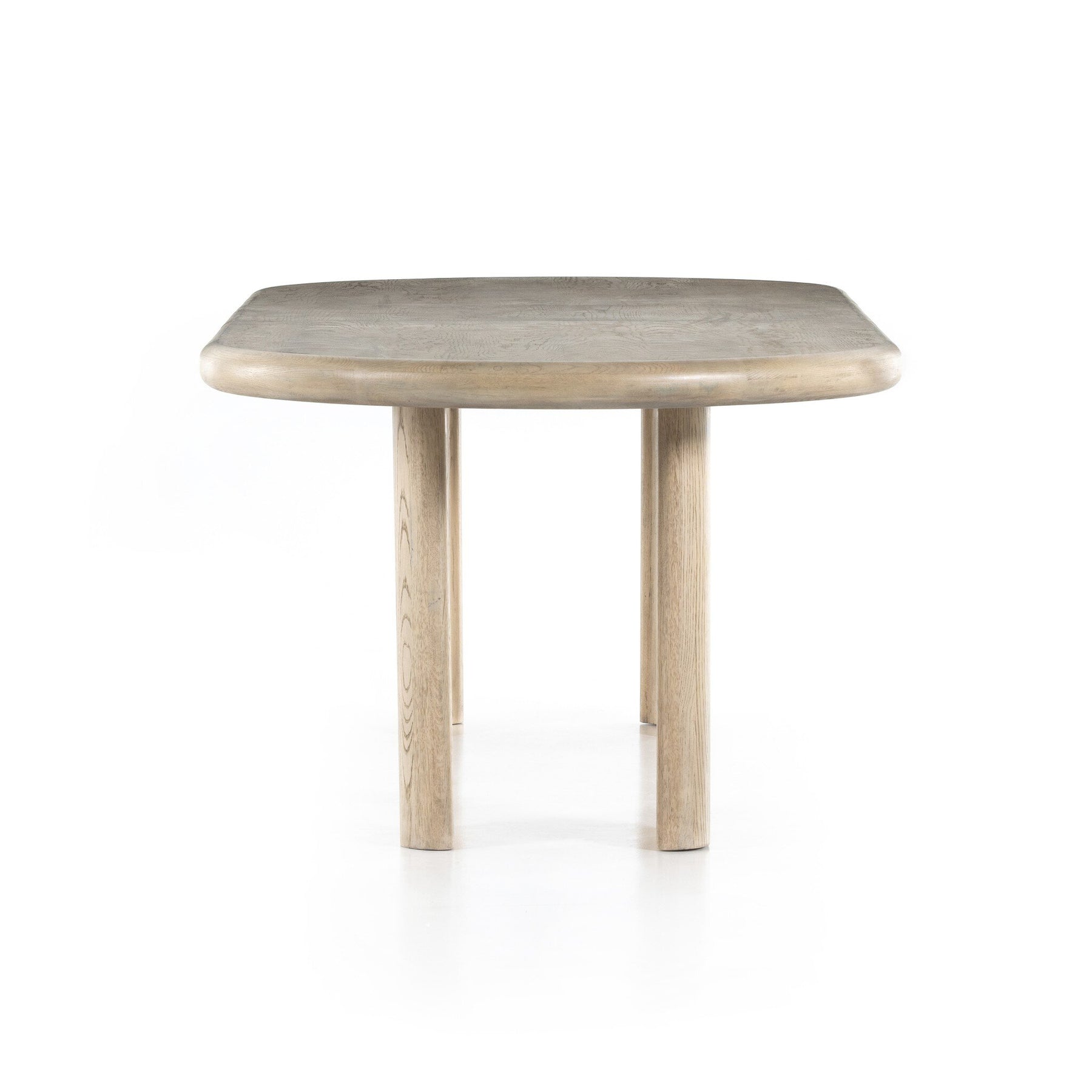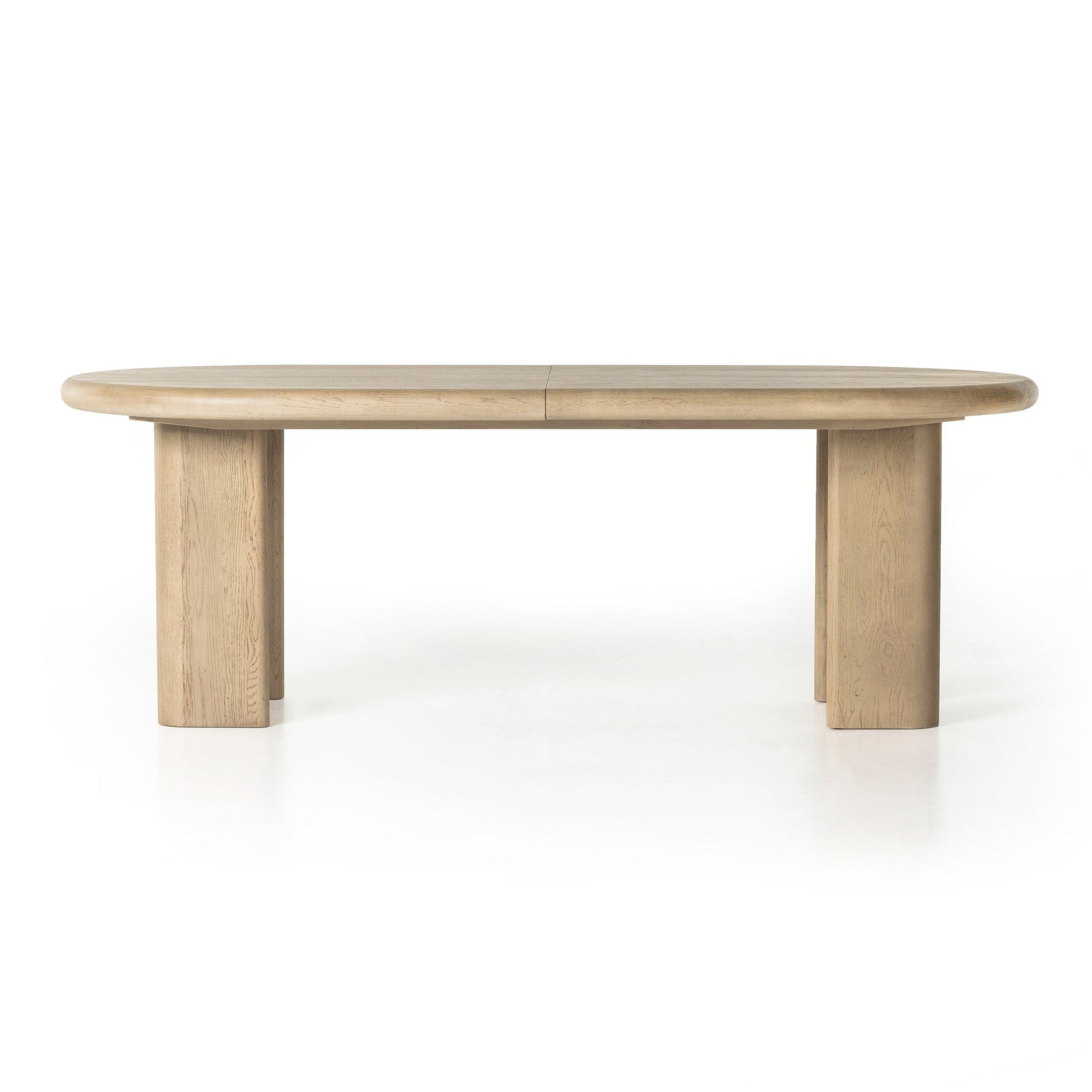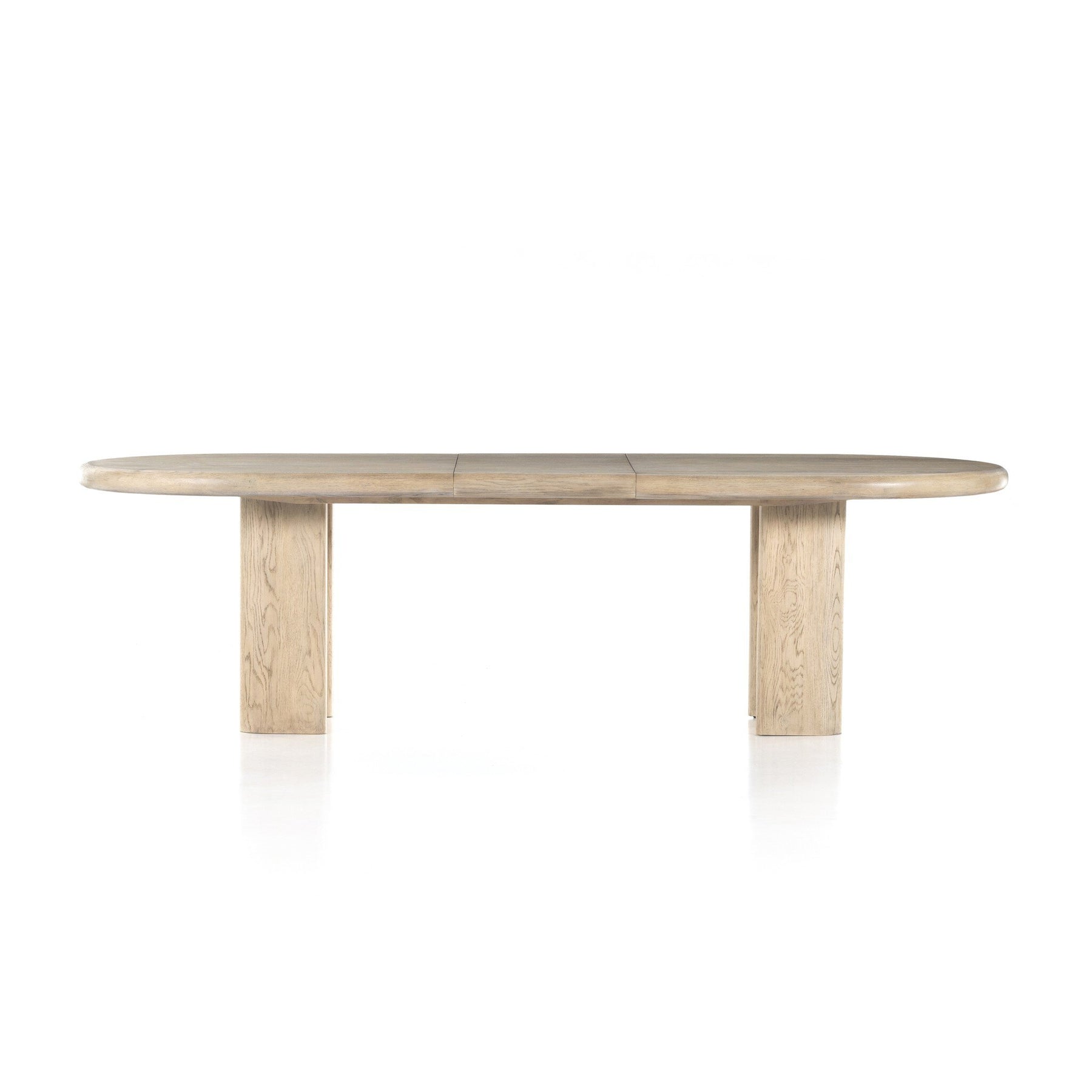 Made from light oak veneer, an oval-shaped dining table flaunts eye-catching curves, with an extension feature that expands the table from 87" to a roomier 107".