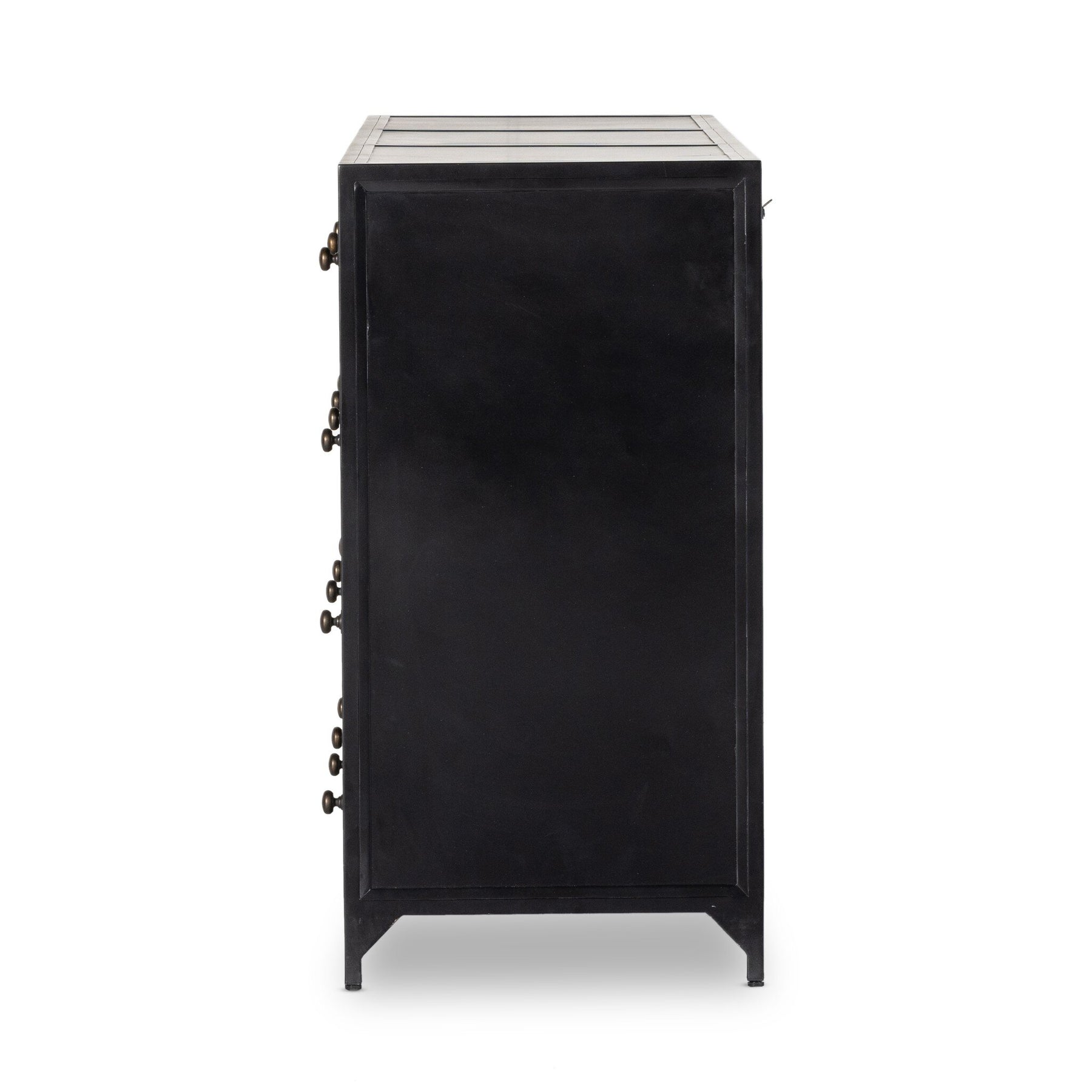 Industrial-inspired, black-finished iron forms a wide and roomy twelve-drawer dresser, with bronzed knobs for contrast.