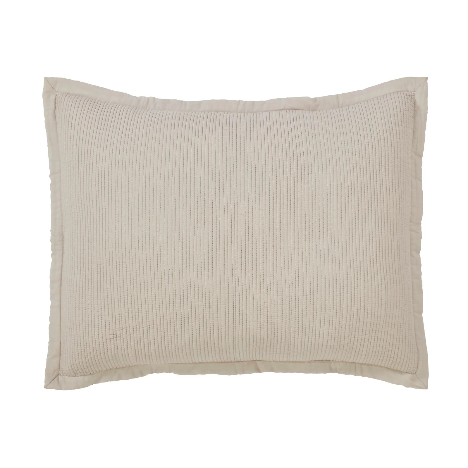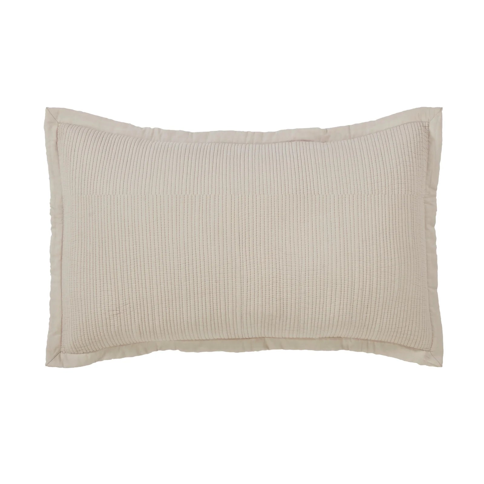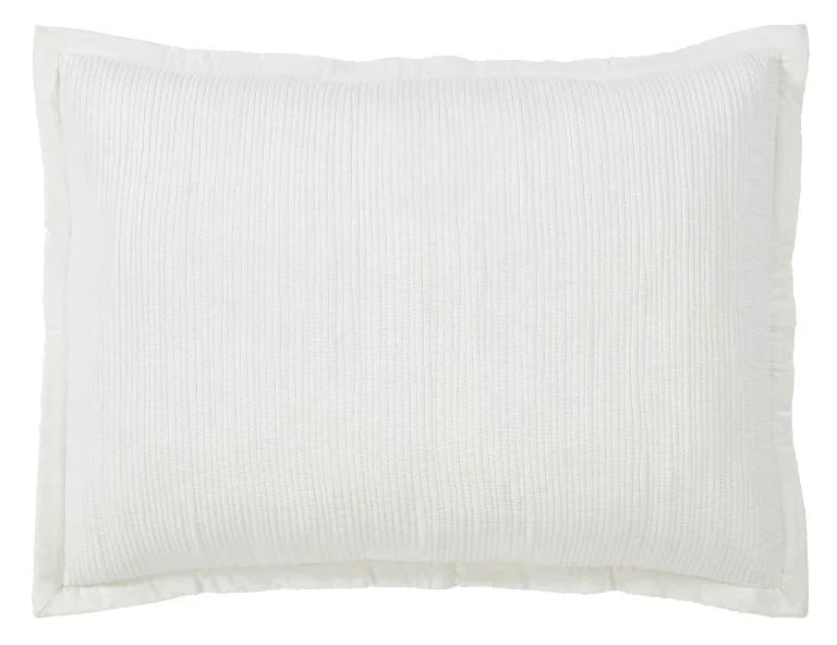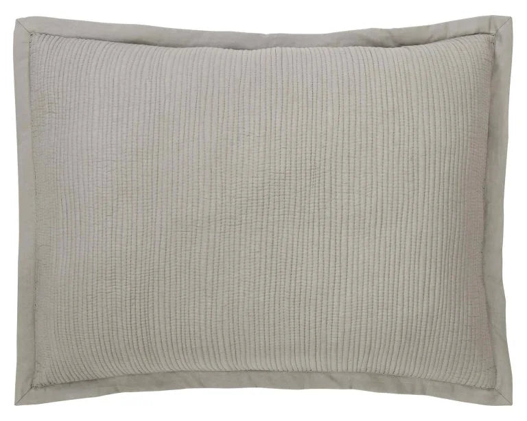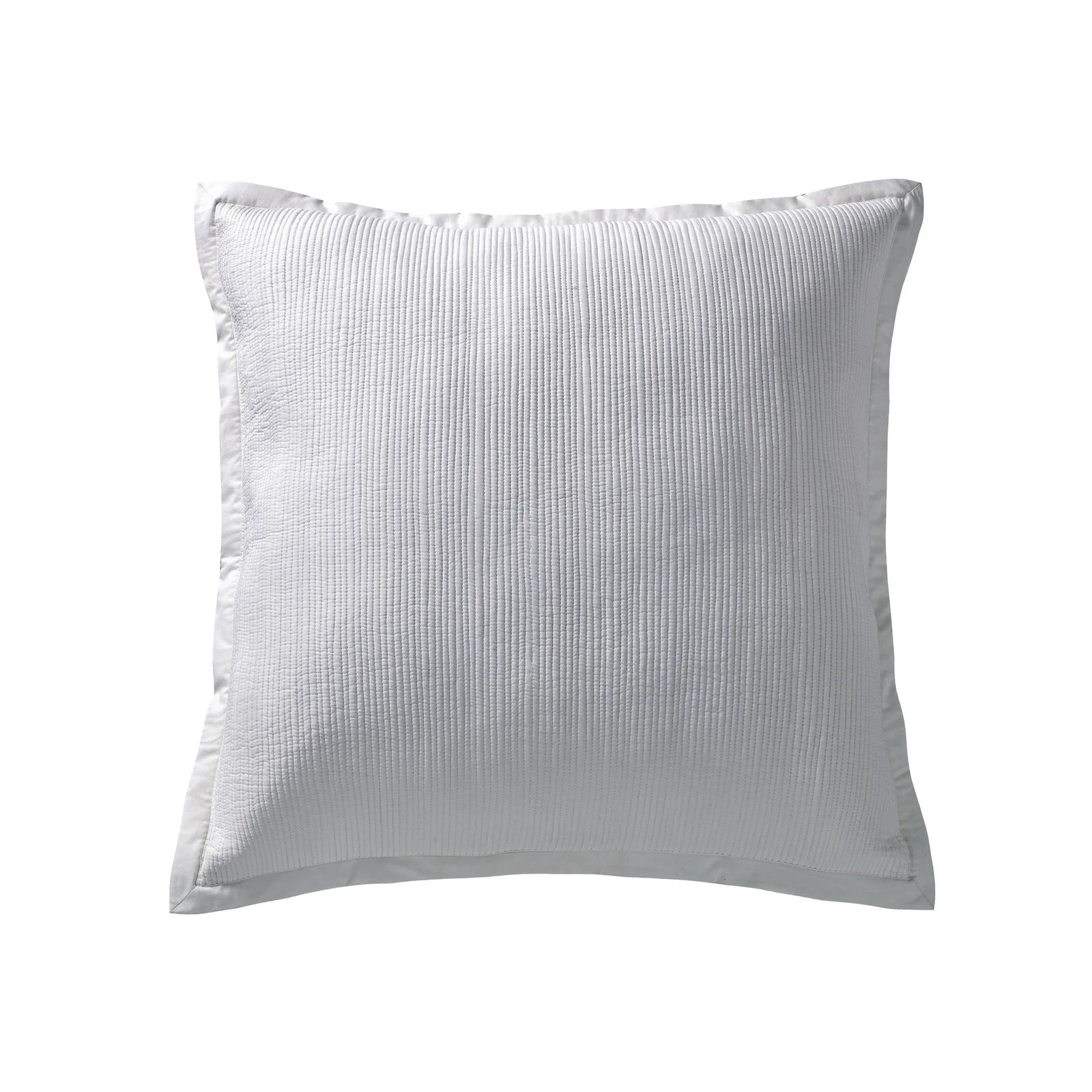 The breezy cotton voile bedding is quilted with lean rows of detailed channel stitching.