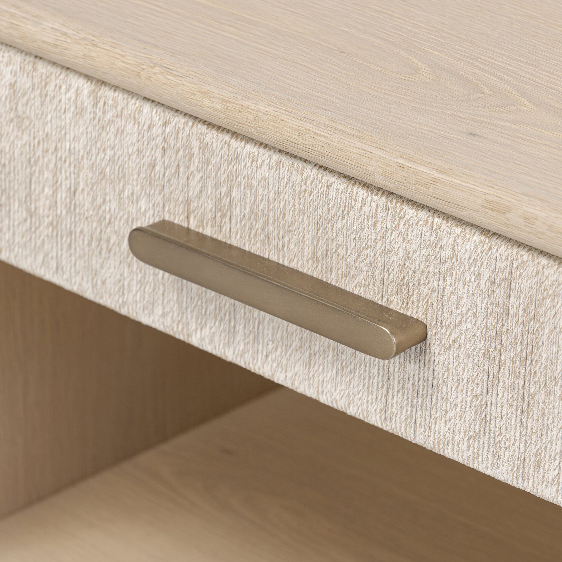Elevate your bedside storage with a nightstand of beautifully finished oak. A smooth top pairs with a single drawer front of woven paper cord for a clean, rich look that will work into your bedroom collection beautifully.