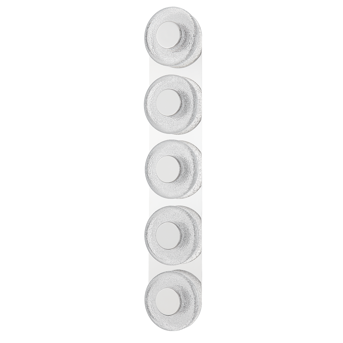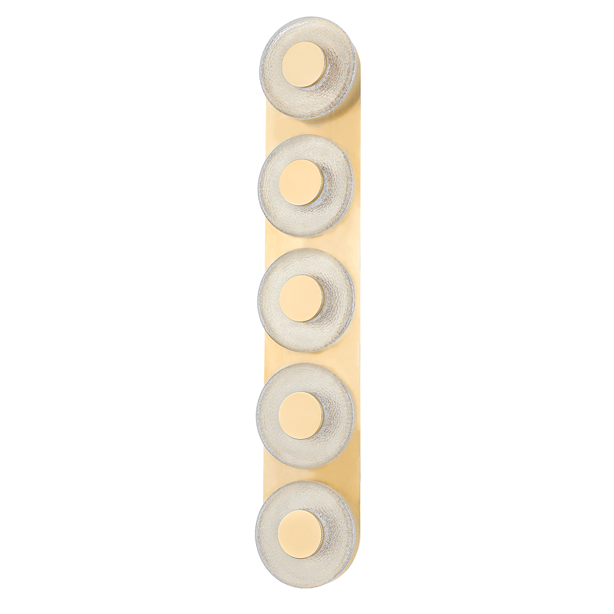 Combining simple shapes, a slim profile and luxe materials to make a big impact, this modern design features thick circles of clear cast glass displayed around rings of Vintage Brass or Polished Nickel. The glass is lit from behind, highlighting the chill marks and adding texture and gorgeous refraction. The three- and five-light sconces can be mounted vertically or horizontally for even more versatility.