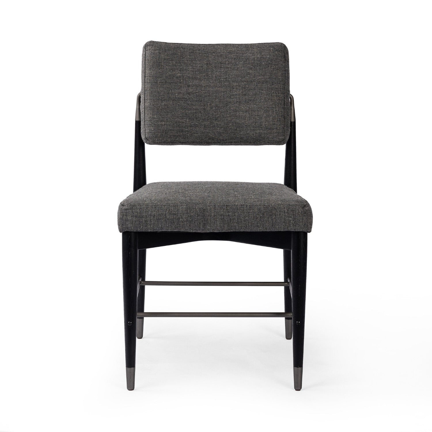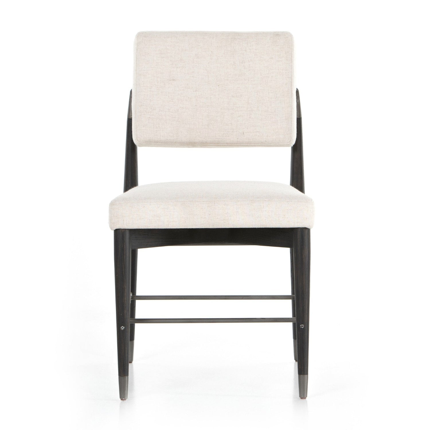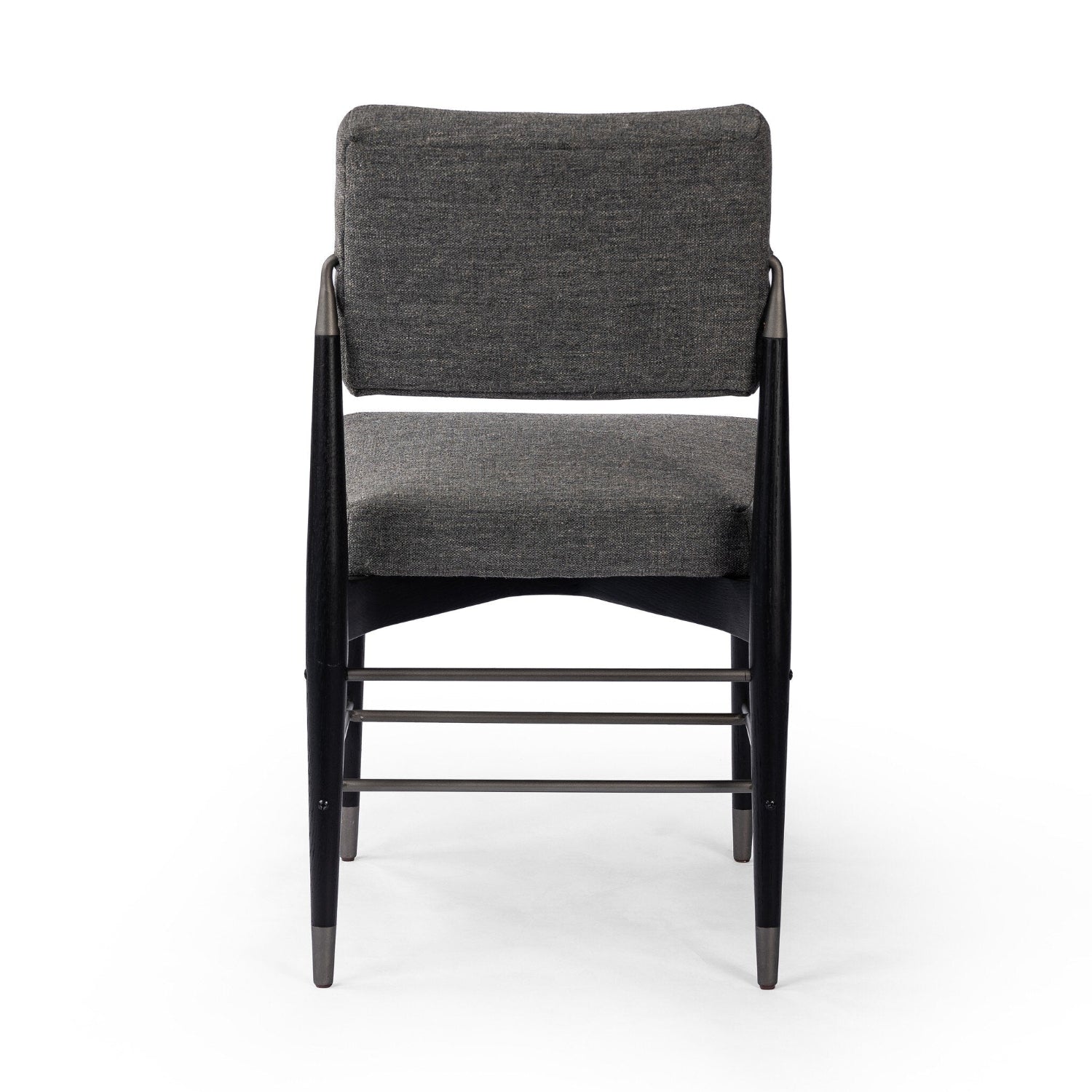 Modern with Eighties undertones. With iron-dipped caps, black-finished tapered legs of solid oak frame. Slim iron stretchers add to an airy, contemporary vibe.