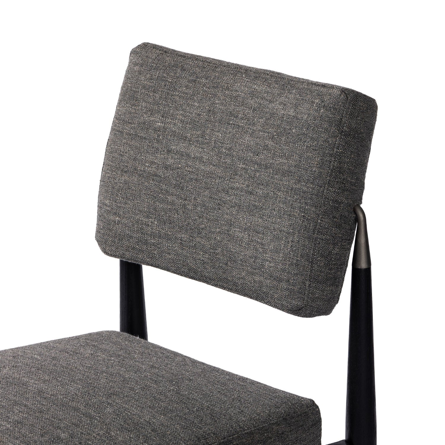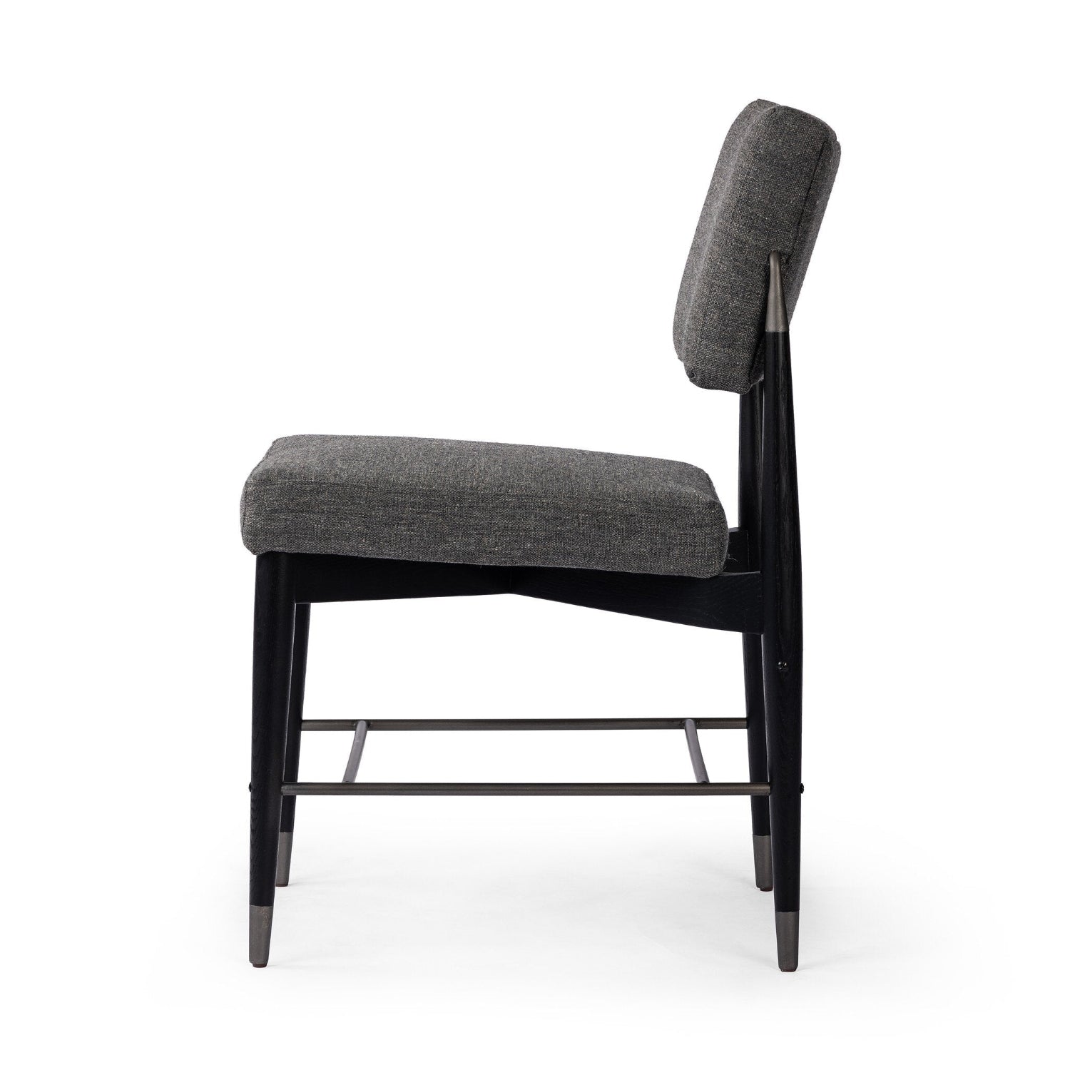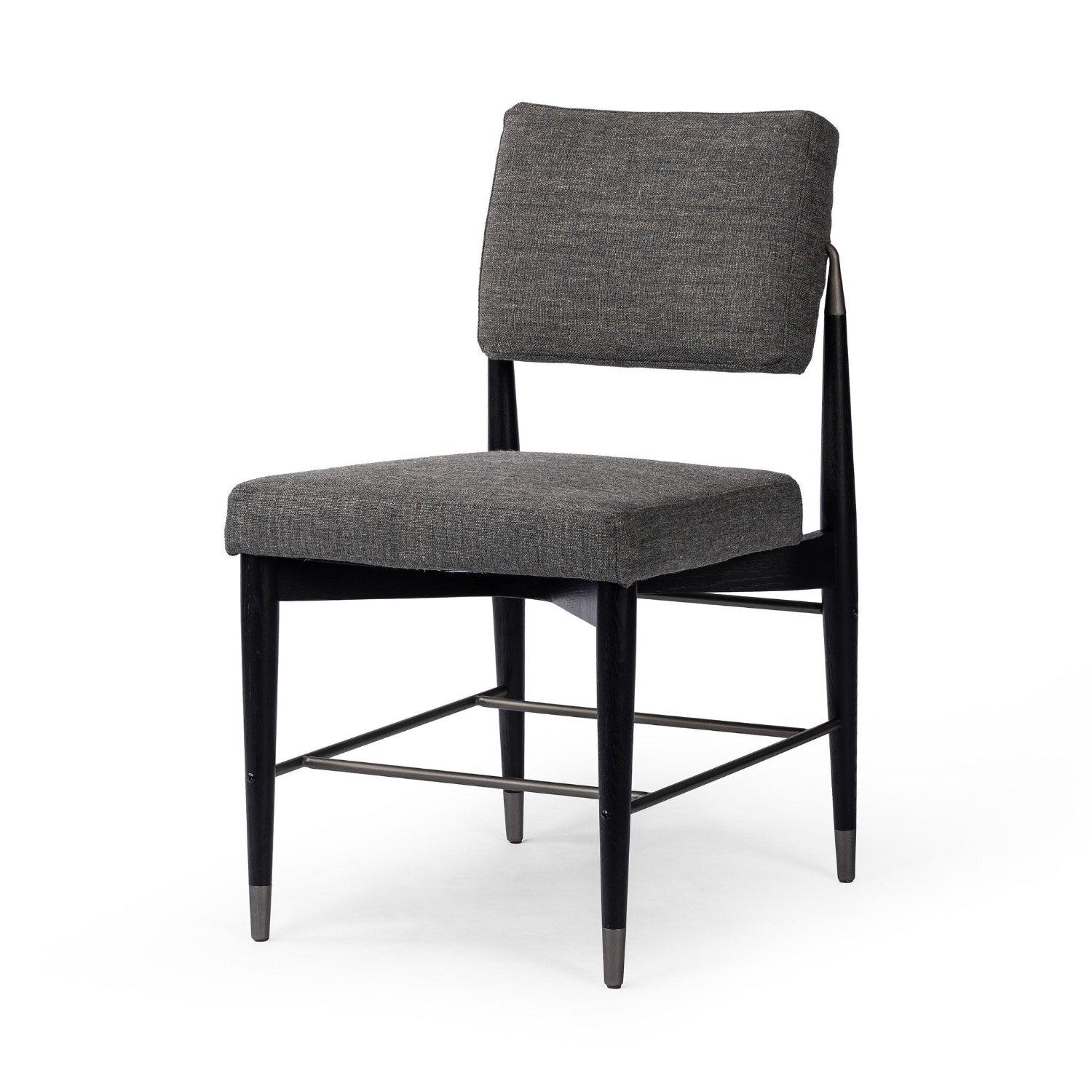 Modern with Eighties undertones. With iron-dipped caps, black-finished tapered legs of solid oak frame. Slim iron stretchers add to an airy, contemporary vibe.