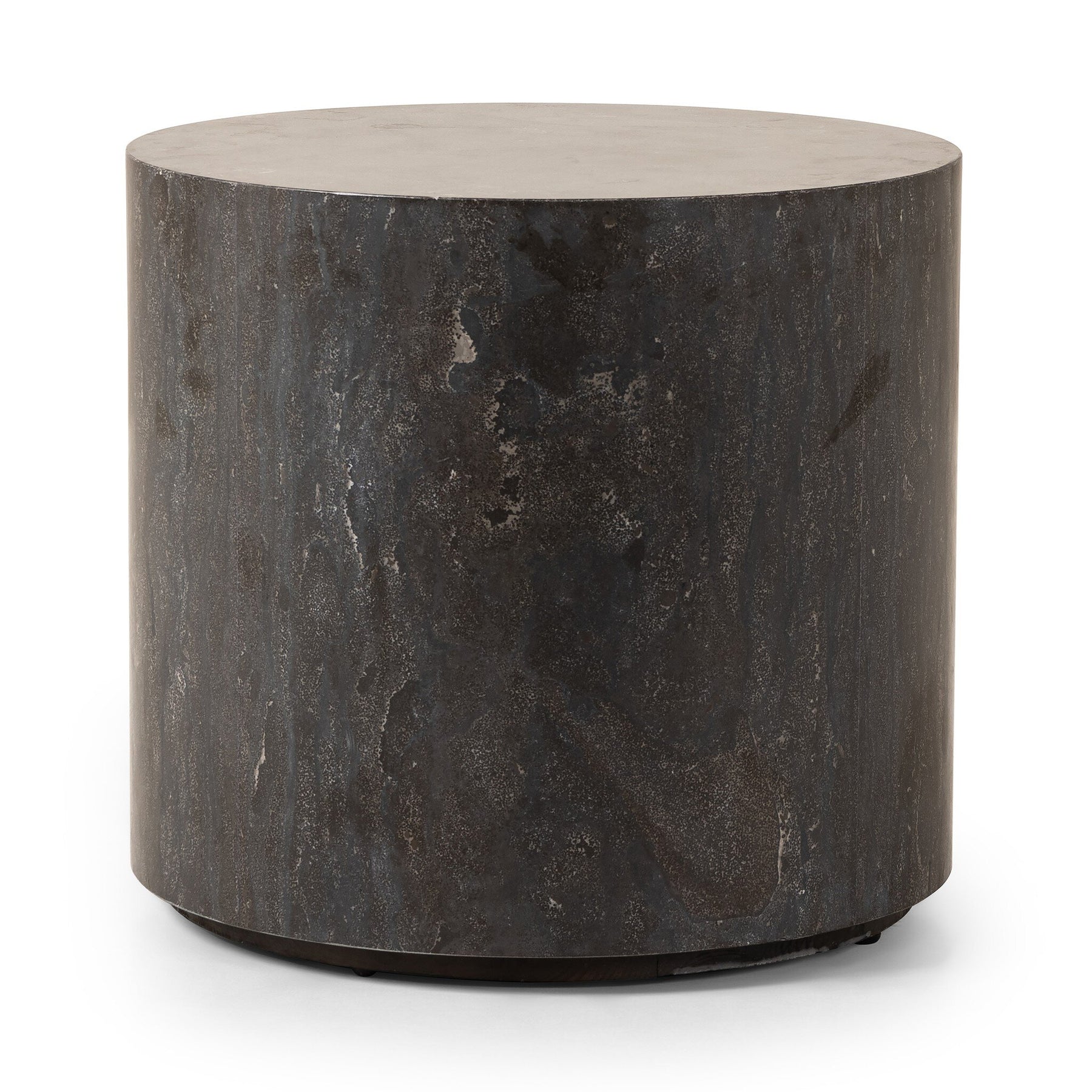 A cylinder-shaped end tables brings an organic look to the living room. Made from natural polished bluestone.