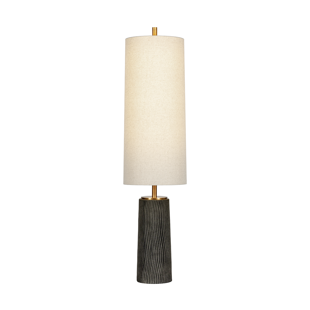 A new archetype in the floor lamp category, Thane features a friendly scale suitable for placement in many rooms. This 'community lamp' features an elongated shade made from natural linen and a low profile, tapered ceramic base finished in a grey glaze. An organic raked pattern reminiscent of the sand lines in a Japanese zen garden has been etched into the surface. Patina Brass accents add a metallic touch at the neck and finial, creating a connection between the elements.
