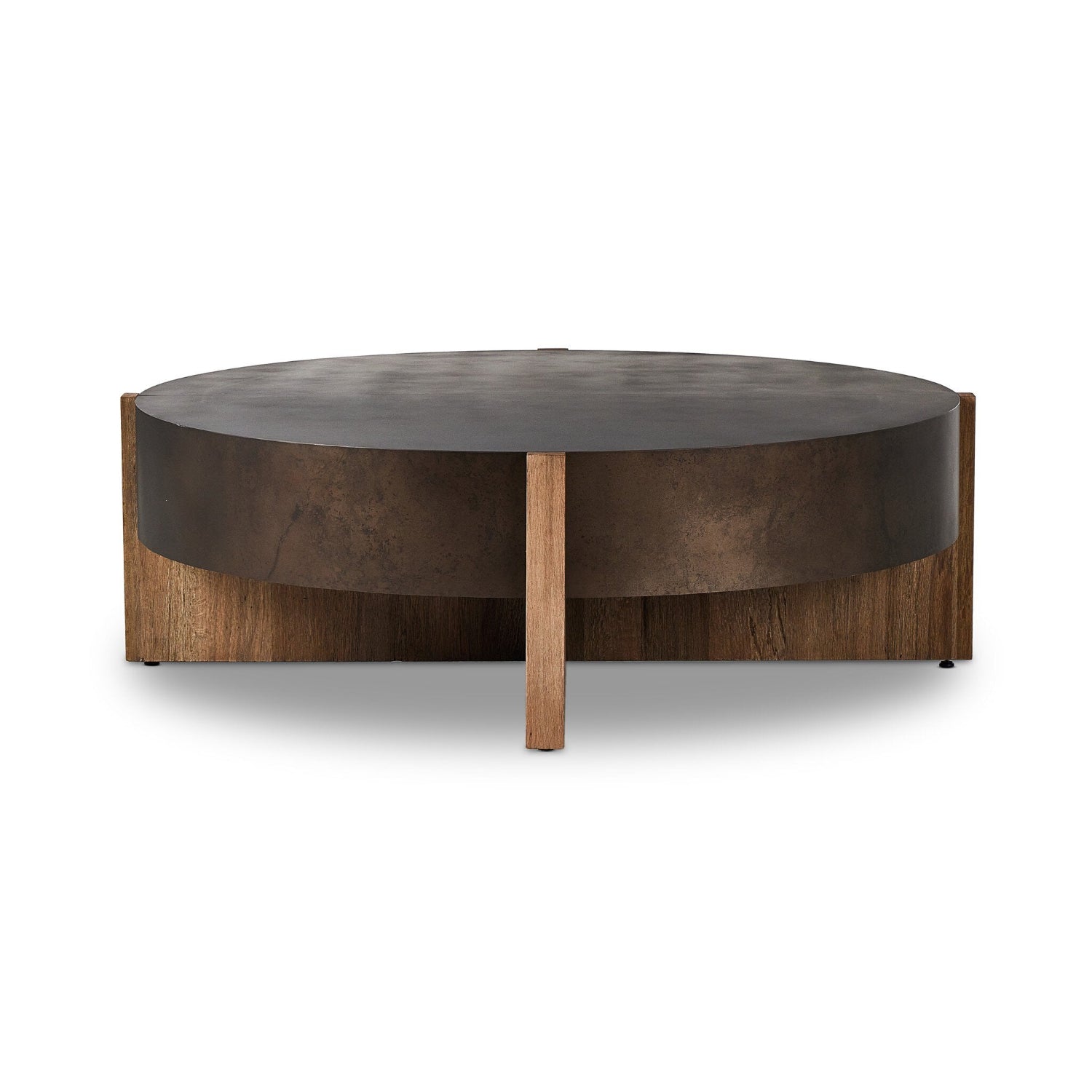 An organic-spirited statement piece. A drum-style coffee table of distressed iron rests within a sculptural cradle base of rustic oak with beautiful highs and lows.