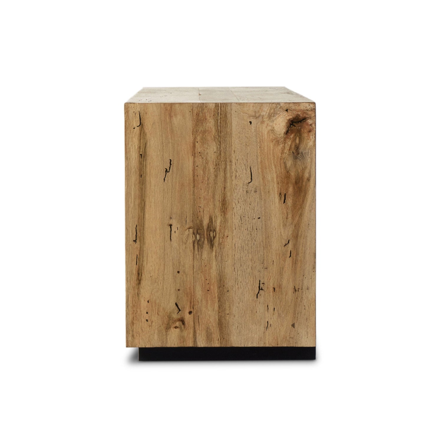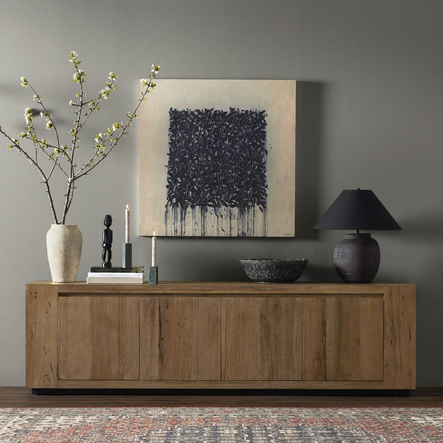 Made from thick-cut oak veneer with a rustic ebony finish, this spacious media console features chunky squared legs and dovetail joinery detailing.